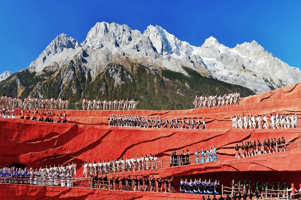 站在藍月湖邊看向玉龍雪山,白雪皚皚,與藍天白云形成一幅絕美佳作;《印象麗江》將人帶到雪域高原天人合一的純美情景中,演繹玉龍雪山下真實的過往。
