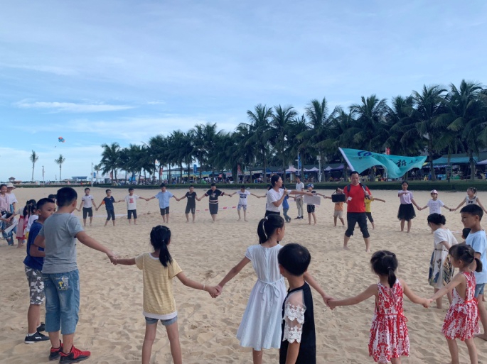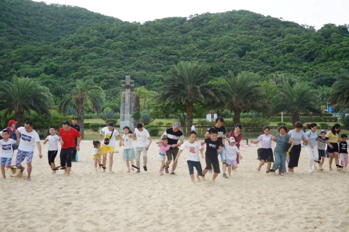 在隨后開展的沙灘游戲中,家長和孩子們樂開了花,歡笑聲、吶喊聲在海邊回響。兩人三足親子活動中,家長和孩子團結(jié)協(xié)作向終點前進,有效增進了孩子與家長之間的感情。