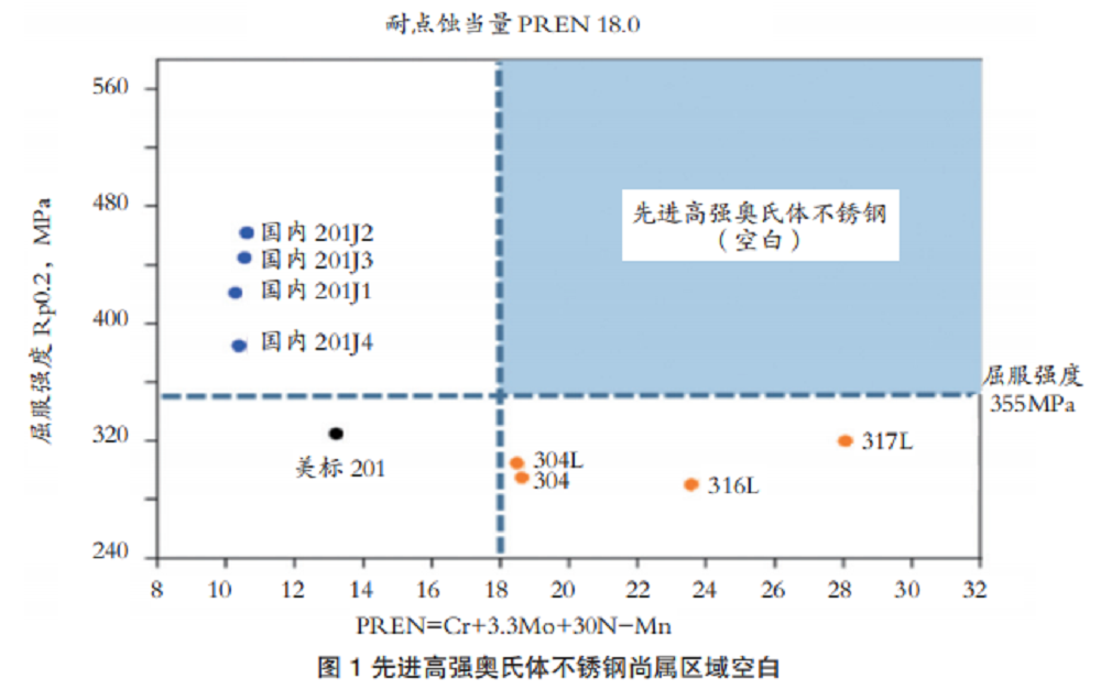 在長達百年的不銹鋼發(fā)展歷程中,以304和316L為代表的鉻鎳系不銹鋼屈服強度只有300MPa左右,在承載結(jié)構(gòu)等領(lǐng)域需加厚使用,高昂的合金成本難以在承載結(jié)構(gòu)領(lǐng)域推廣,碳排放也高。近幾十年來,國內(nèi)外已產(chǎn)業(yè)化了14%Cr-1%Ni和16%Cr-4%Ni兩大類節(jié)鎳奧氏體不銹鋼,其屈服強度提升,但耐點蝕當(dāng)量PREN(%Cr+3.3(%Mo)+30(%N)-Mn)值低于16.0,耐蝕性遠(yuǎn)不如304不銹鋼,使用壽命短,只能在干燥地區(qū)以及室內(nèi)裝飾等場景使用。為此,室外承載結(jié)構(gòu)領(lǐng)域市場亟需耐蝕性良好的高強奧氏體不銹鋼,也即先進高強奧氏體不銹鋼(圖1)。