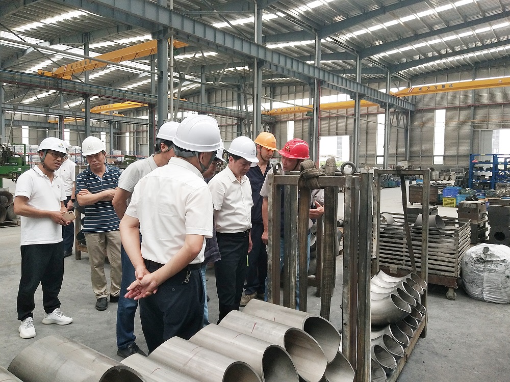 葉其發(fā)一行先后參觀了焊管事業(yè)部、管件事業(yè)部生產(chǎn)車間,詳細(xì)了解項(xiàng)目建設(shè)情況以及周邊配套情況,仔細(xì)詢問項(xiàng)目在建設(shè)中遇到的實(shí)際問題,并對(duì)下一步工作提出了相關(guān)要求。管件副經(jīng)理劉志強(qiáng)和焊管小管車間主任趙威俊對(duì)產(chǎn)品種類、主要工序、生產(chǎn)規(guī)模、設(shè)備情況、市場(chǎng)情況、項(xiàng)目規(guī)劃等情況做了詳細(xì)介紹。聽取介紹后,葉其發(fā)圍繞產(chǎn)品特點(diǎn)和設(shè)備操作、機(jī)械自動(dòng)化等細(xì)節(jié)提出了相關(guān)問題,李啟光等一一作出了解答。