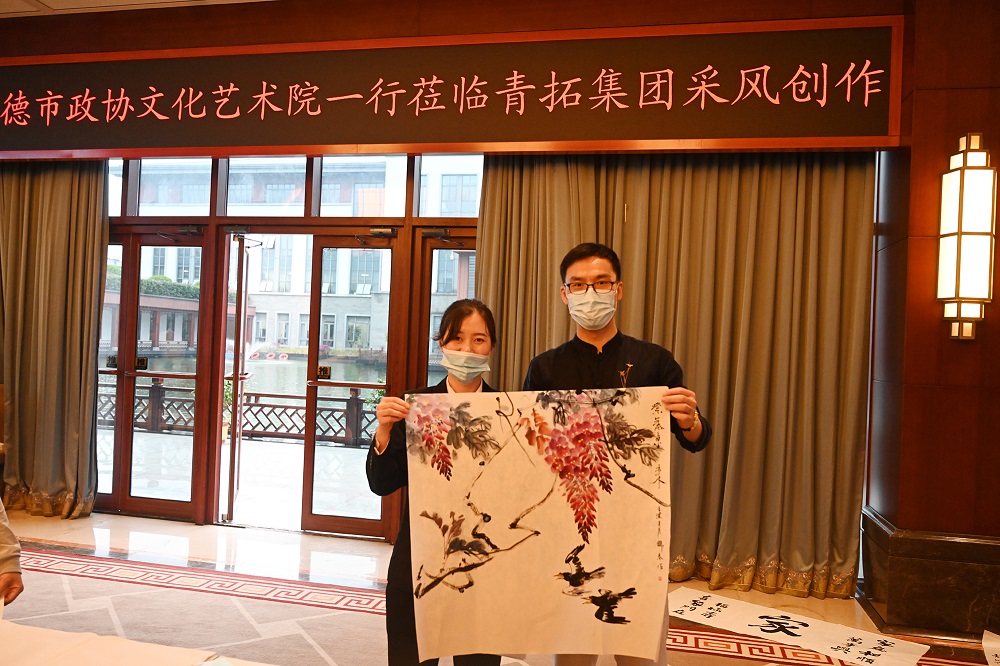 在水上會議廳,政協(xié)文化藝術(shù)院一行分為書法組、繪畫組開始實(shí)地創(chuàng)作。宣紙徐徐鋪開,陣陣墨香撲鼻,調(diào)色、點(diǎn)墨、勾勒,行云流水之間,舉筆信手涂抹幾下,一幅國色天香的牡丹即躍然紙上。水墨青花,揮竹毫描描畫畫,筆下牡丹絕代風(fēng)華,花繁色艷、雍容華貴、迎風(fēng)搖曳,兼有色、形、韻之美。