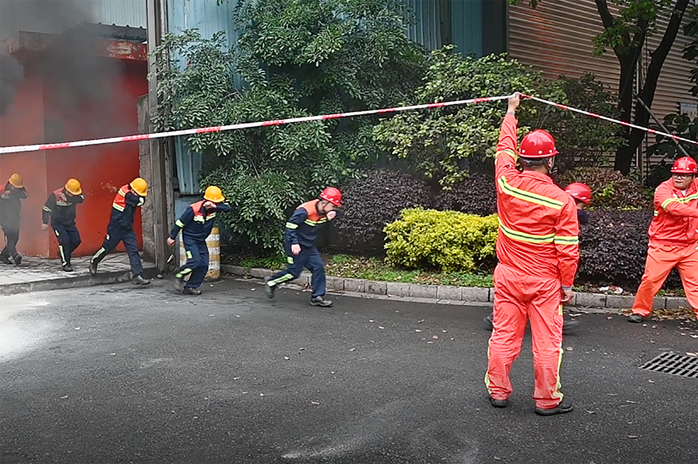 各單位小組到達(dá)現(xiàn)場(chǎng)后,向?qū)д{(diào)組請(qǐng)示作戰(zhàn)任務(wù)。10時(shí),警報(bào)聲起演練開(kāi)始。青拓科技員工跟隨安全員有序離開(kāi)廠區(qū),依據(jù)疏散路線迅速集合到安全地帶,總指揮部下令緊急救援。參戰(zhàn)人員按照指揮組的指令,消防戰(zhàn)士派出移動(dòng)水炮、舉高消防車(chē),人機(jī)協(xié)同、分工合作,利用設(shè)置陣地,實(shí)施堵截,控火滅火。經(jīng)過(guò)近45分鐘的緊張救援,現(xiàn)場(chǎng)施救大隊(duì)分工協(xié)作,被困人員得到及時(shí)救治、消防后勤小組于場(chǎng)外提供有力支援,火勢(shì)得到及時(shí)控制,青拓科技廠區(qū)實(shí)戰(zhàn)演練圓滿(mǎn)結(jié)束。
