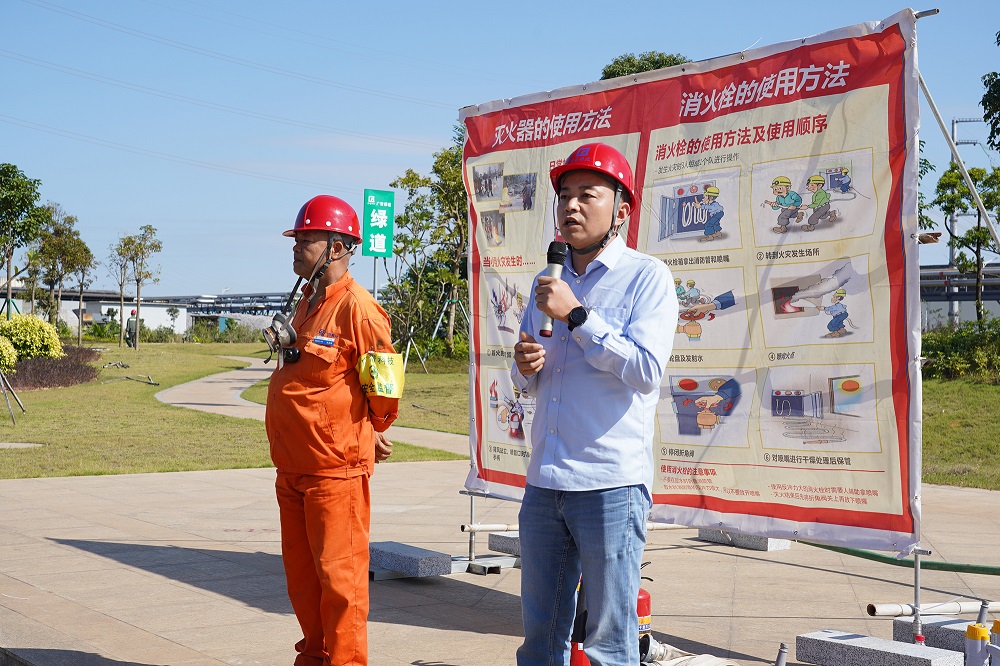 演練中,專職消防隊指導員梁正芳講解了消防安全知識、火災預防措施以及滅火器的操作方法等消防常識,并由兼職消防隊員配合示范滅火器材的使用方法,指導員工在面對火災時一定要冷靜、不慌亂,采取正確的自救和求救措施。