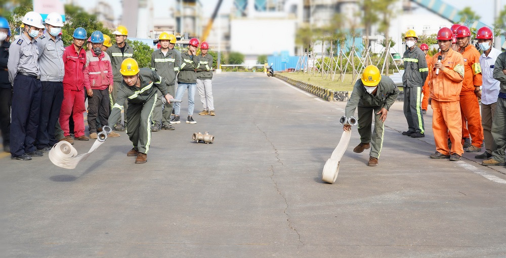 全體參演員工面對提前準備好的火堆,熟練地按照滅火的步驟和方法,將燃起的濃煙大火迅速撲滅。員工們還兩人一組進行了消防水帶拋接實操演練。