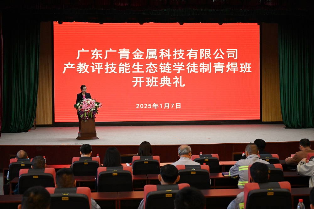 1月7日,由陽江市人力資源和社會保障局主辦、廣東廣青金屬科技有限公司與陽江市中烏巴頓職業(yè)培訓(xùn)學(xué)校聯(lián)合舉辦的產(chǎn)教評技能生態(tài)鏈學(xué)徒制青焊班在公司四樓禮堂開班。市人力資源和社會保障局黨組成員、副局長車代表,公司黨委副書記、工會主席王大慶,中烏巴頓職業(yè)培訓(xùn)學(xué)校校長任香會,市、區(qū)人社局、鏈員企業(yè)有關(guān)負責(zé)人、企業(yè)導(dǎo)師及焊工班學(xué)員約40余人參加開班典禮。