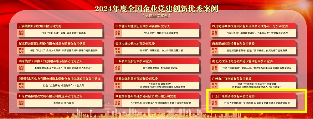 8月3日,以“以高質(zhì)量黨建賦能新質(zhì)生產(chǎn)力發(fā)展,在改革開放中肩負(fù)起中國式現(xiàn)代化偉大使命”為主題的2024全國企業(yè)黨建(案例)研討會暨第四屆企業(yè)黨建創(chuàng)新優(yōu)秀案例發(fā)布儀式在北京召開。會上公布了“2024年度全國企業(yè)黨建創(chuàng)新優(yōu)秀案例”名單,廣東廣青金屬科技有限公司黨委《打造“雙擎四驅(qū)”黨建品牌 以高質(zhì)量黨建引領(lǐng)企業(yè)高質(zhì)量發(fā)展》案例被評選為“2024年度全國企業(yè)黨建創(chuàng)新優(yōu)秀案例(黨建品牌案例)”。