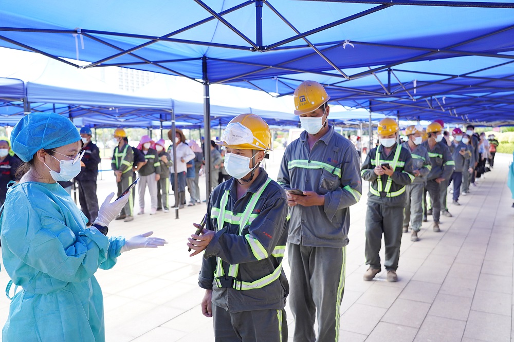 近期陽江迎來今年以來最強(qiáng)的持續(xù)性暴雨天氣,這給全員核酸檢測工作帶來一定影響。為了應(yīng)對惡劣天氣,確保生產(chǎn)、防疫工作兩不誤,公司第一時間成立工作領(lǐng)導(dǎo)小組,制定詳細(xì)的工作實施方案,召開疫情防控部署會議,爭分奪秒做好各項前期準(zhǔn)備工作。在時間緊、任務(wù)急的情況下,采購人員緊急購入60頂帳篷及雨衣雨具,安保人員加班加點、冒雨搭建檢測通道。采樣當(dāng)天,公司黨員先鋒隊、志愿者等工作人員積極協(xié)助醫(yī)務(wù)人員,做好測溫、掃碼、采樣等工作,整個環(huán)節(jié)運轉(zhuǎn)高效,僅歷時3個半小時便完成全員采樣工作。
