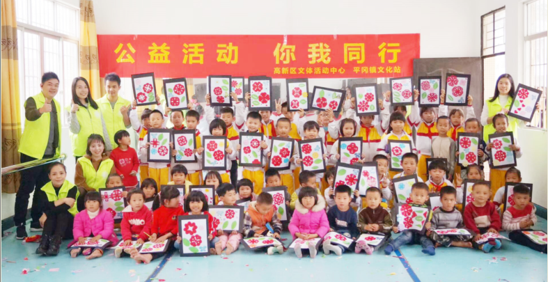 志愿者們首先來(lái)到東一小學(xué),并迅速把學(xué)校舞蹈室打掃干凈。小學(xué)生在志愿者和學(xué)校教師的引導(dǎo)下,每10 人圍坐一圈,志愿者向?qū)W生們派發(fā)剪紙工具,如剪刀、固體膠以及各色剪紙,學(xué)生們拿在手上顯得興奮不已。課堂上,高新區(qū)文化中心志愿者為學(xué)生們邊演示邊傳授剪紙方法,并手把手耐心地一一進(jìn)行指導(dǎo),學(xué)生們也聚精會(huì)神地認(rèn)真觀摩。隨后,小學(xué)生在廣青志愿者的陪同和指導(dǎo)下,動(dòng)手剪出了各種各樣的圖案。學(xué)生們滿懷喜悅地欣賞著剪紙作品,教室里傳出了一陣陣的歡聲笑語(yǔ)。在充滿童趣的活動(dòng)最后,志愿者向?qū)W生們每人派發(fā)了一份小禮物,并與學(xué)生們拍照留念,為此次活動(dòng)畫上了圓滿的句號(hào)。