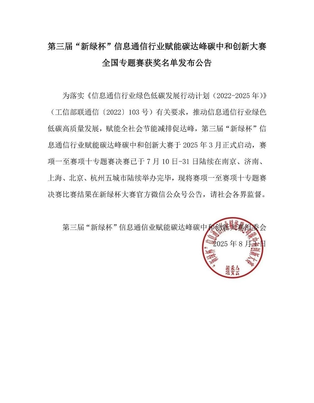 “新綠杯”大賽由工業(yè)和信息化部指導(dǎo)、中國(guó)信息通信研究院主辦,是信息通信領(lǐng)域最具影響力的“雙碳”賽事之一,旨在遴選并推廣行業(yè)領(lǐng)先的綠色低碳技術(shù)與應(yīng)用案例,加速優(yōu)秀實(shí)踐經(jīng)驗(yàn)規(guī)?;涞兀ぐl(fā)產(chǎn)業(yè)創(chuàng)新動(dòng)能,助力“雙碳”目標(biāo)實(shí)現(xiàn)。