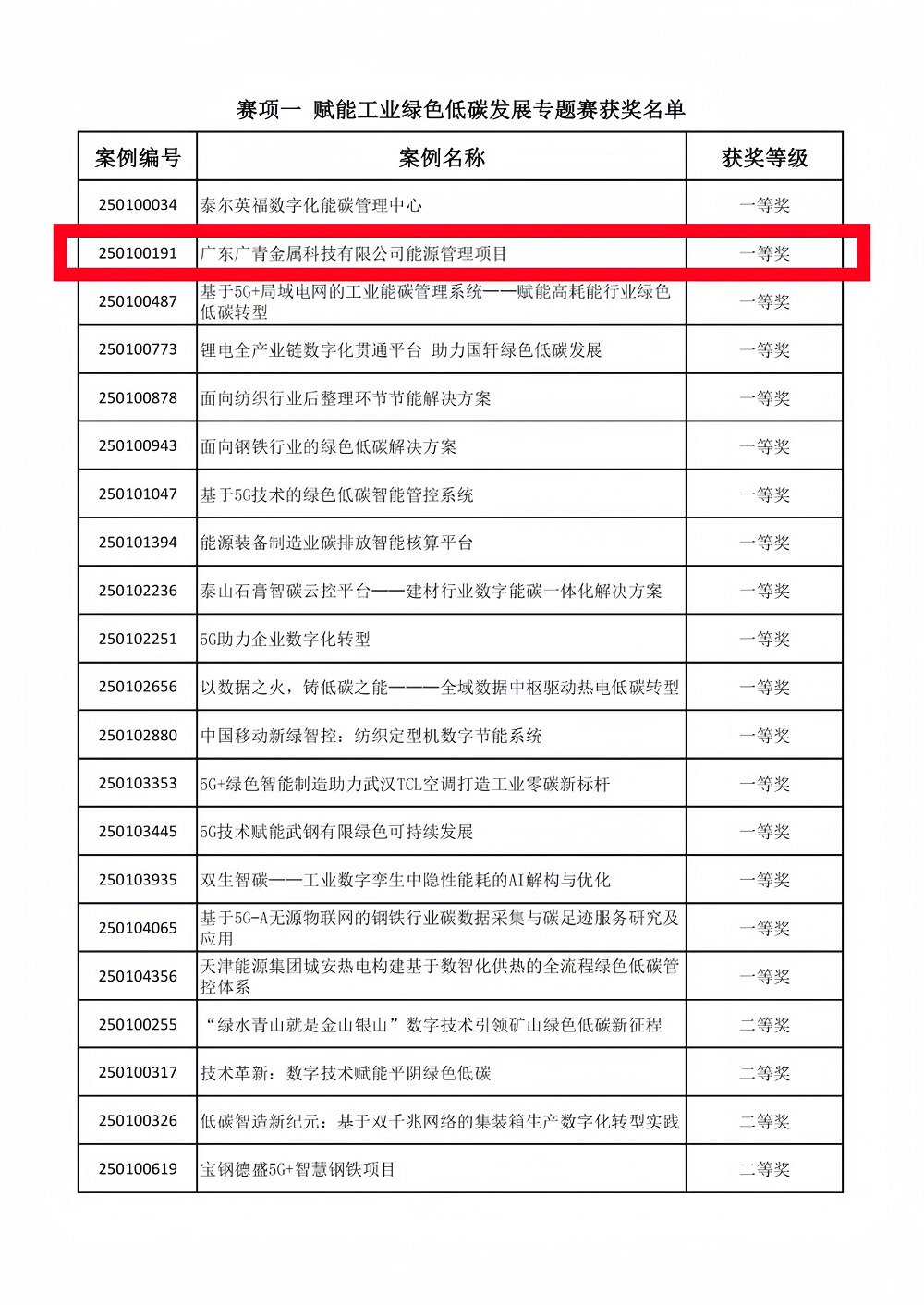 近日,第三屆“新綠杯”信息通信行業(yè)賦能碳達(dá)峰碳中和創(chuàng)新大賽全國(guó)專題賽獲獎(jiǎng)名單公布,廣東廣青金屬科技有限公司能源管理項(xiàng)目榮獲“賦能工業(yè)綠色低碳發(fā)展”專題賽一等獎(jiǎng)。