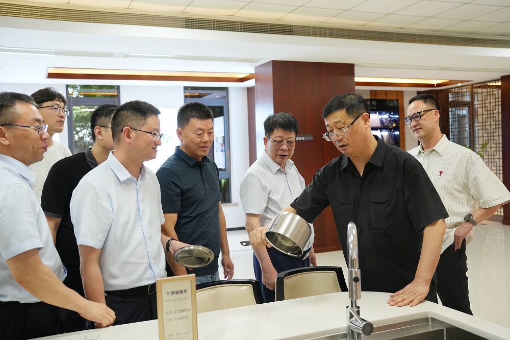 陳亦軍一行首先在青拓集團供銷大廳聽取工作人員的詳細介紹,了解企業(yè)發(fā)展歷程、科技創(chuàng)新成果以及青拓集團在灣塢半島的不銹鋼產(chǎn)業(yè)鏈布局情況。隨后,在陳慶科的陪同下,一行人員參觀了不銹鋼家具展廳。展廳內(nèi),各式不銹鋼家具引人注目,這些家具不僅零甲醛、耐腐蝕,而且具備回收再利用的特性,充分體現(xiàn)了綠色低碳的發(fā)展理念。