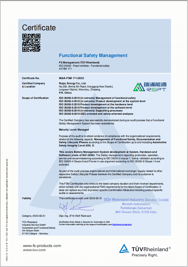 近日,瑞浦蘭鈞能源股份有限公司獲得由國際獨立第三方檢測、檢驗和認證機構(gòu)德國萊茵TüV頒發(fā)的ISO 26262功能安全管理體系ASIL D等級認證證書。