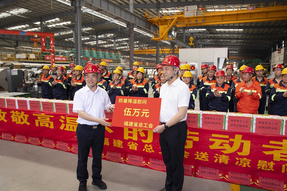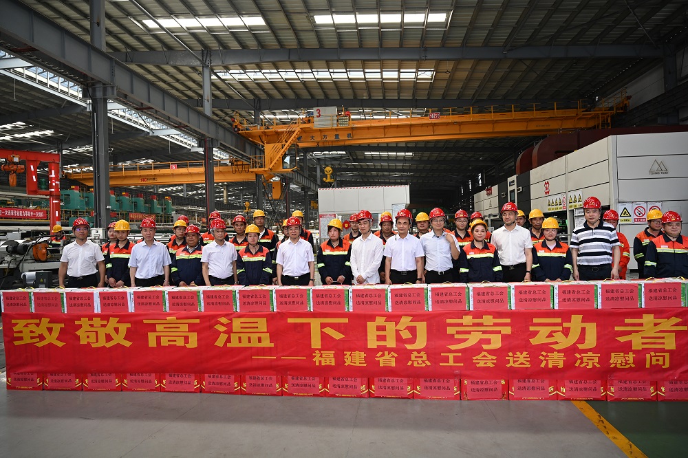 連日來,高溫肆虐,酷暑難當(dāng),給堅守一線崗位的勞動者帶來嚴(yán)峻的考驗。6月29日,福建省人大常委會黨組副書記、副主任,省總工會主席周聯(lián)清率調(diào)研組到青拓集團(tuán)有限公司參觀調(diào)研,同時深入生產(chǎn)車間開展高溫送清涼慰問活動。寧德及福安市領(lǐng)導(dǎo)王世雄、張雄、黃其山、尤鋒云、陳昌東等陪同,青拓集團(tuán)董事長姜海洪、總裁陳慶科,行政總經(jīng)理、工會主席鐘盛江進(jìn)行熱情接待。