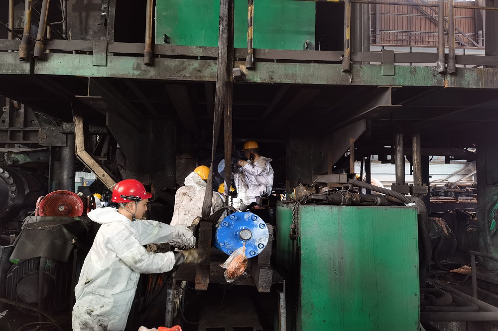 軋線是生產(chǎn)車間的高溫區(qū)域,在室外高溫疊加的情況下,更如烤爐一般。每次帶著客戶參觀,一趟下來都會大汗淋漓。時常能看到一群人,廠服外又套上一層白色防護(hù)服,蹲在軋線旁邊作業(yè),他們是青拓輝煌的基石。