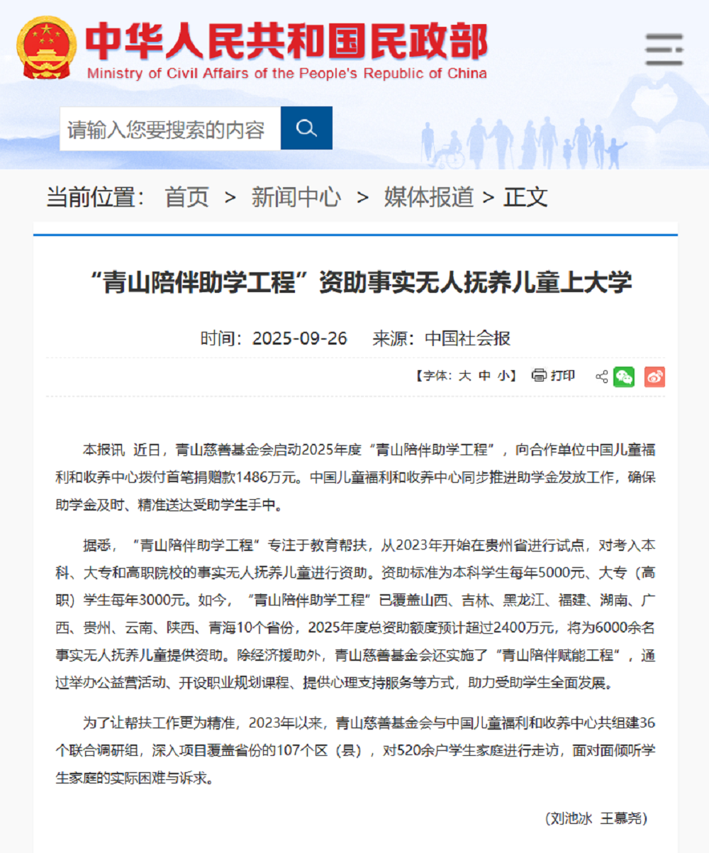 9月26日,國家民政部官網(wǎng)轉(zhuǎn)載了《中國社會報》刊發(fā)的“青山陪伴助學工程”項目相關(guān)報道,體現(xiàn)了國家民政部門對該項目成效與模式的認可,進一步擴大了項目影響力,為全國兒童福利與教育幫扶工作提供了示范參考。