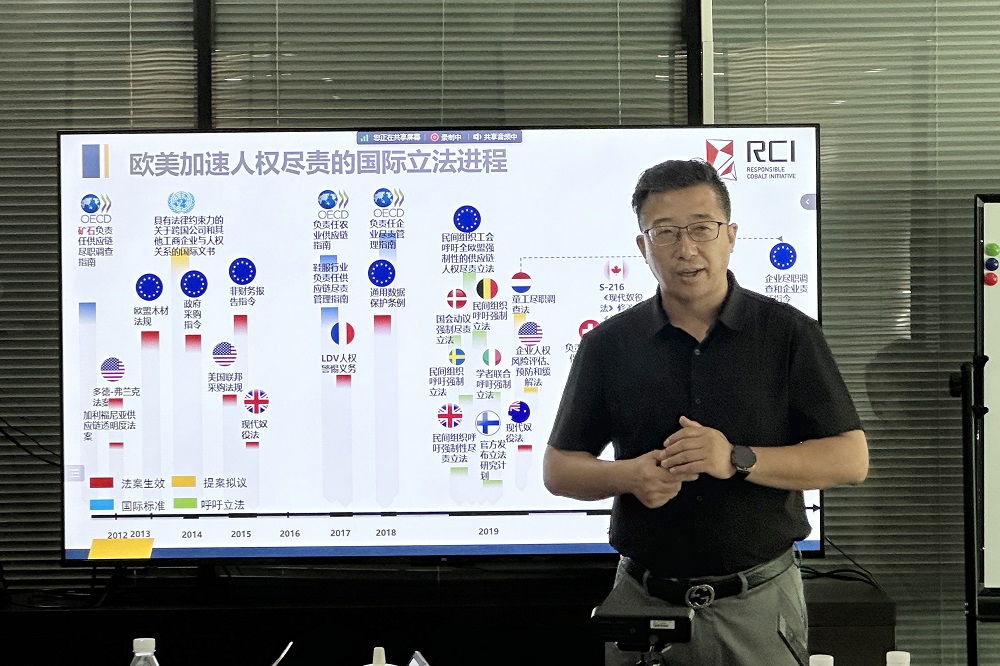 中國五礦化工進(jìn)出口商會(huì)主任孫立會(huì)做了題為《國際規(guī)則重構(gòu)背景下礦產(chǎn)及電池行業(yè)面臨的ESG風(fēng)險(xiǎn)與應(yīng)對實(shí)踐》的專題輔導(dǎo)。他深度介紹了國際規(guī)則趨勢、德國人權(quán)法規(guī)、歐盟電池法規(guī)、采礦業(yè)ESG風(fēng)險(xiǎn)、供應(yīng)鏈的風(fēng)險(xiǎn)、盡責(zé)管理體系;針對歐盟新電池法規(guī),重點(diǎn)分析法規(guī)的形成過程、主要內(nèi)容、帶來的挑戰(zhàn)及應(yīng)對策略;參考《中國礦產(chǎn)供應(yīng)鏈盡責(zé)管理指南》,詳細(xì)分析供應(yīng)鏈盡責(zé)管理過程的“六步法”,即建立企業(yè)盡責(zé)管理體系、風(fēng)險(xiǎn)識(shí)別與評估、風(fēng)險(xiǎn)預(yù)防和緩解、內(nèi)外部評估、報(bào)告與溝通、適時(shí)提供條件或開展合作進(jìn)行補(bǔ)救。