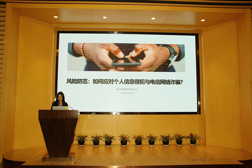 青山控股法律事務(wù)部法務(wù)專員彭心怡講述了如何應(yīng)對(duì)網(wǎng)絡(luò)詐騙與個(gè)人信息侵犯等相關(guān)知識(shí),她從一個(gè)個(gè)日常生活中的鮮活案例入手,剖析了各類因網(wǎng)絡(luò)安全引起的典型事件,生動(dòng)詮釋了網(wǎng)絡(luò)安全防范不足滋生的一系列問(wèn)題、存在的安全威脅以及如何做好相關(guān)風(fēng)險(xiǎn)的預(yù)防措施,使得在場(chǎng)參會(huì)人員受益匪淺。