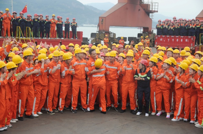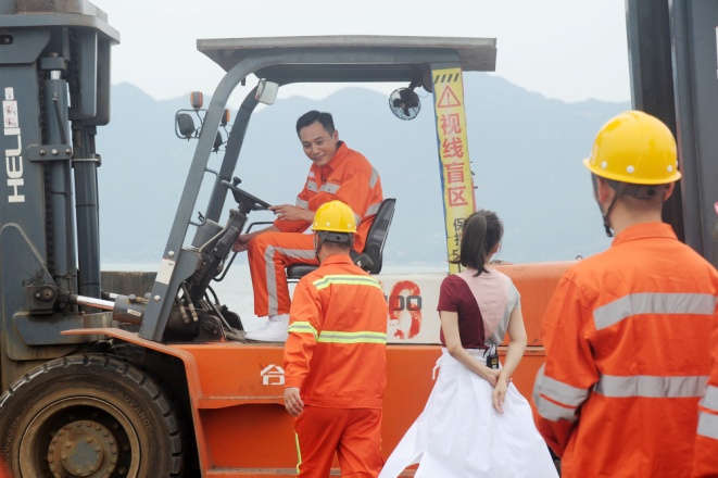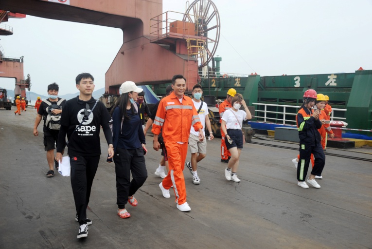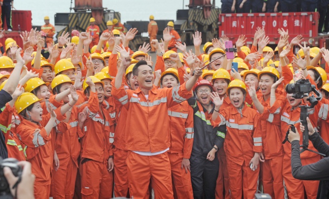 青拓物流5#、6#、7#碼頭在熱烈氣氛中盼來了主持人張蕾和嘉賓劉燁。門座式起重機(jī)拔地參天,貨運(yùn)輪船如海上堡壘,以白馬河蕩漾水波為背景,員工們身著工服簇?fù)碇餍羌钨e,橙紅鮮亮,深藍(lán)沉穩(wěn),匯成色彩與歌聲的海洋。放聲高歌,振臂揮舞,以歌言夢,“奮斗才會有幸福,勞動(dòng)最風(fēng)流”,青拓人吹響時(shí)代號子;“富饒神州我的故鄉(xiāng),東西南北絢麗的舞臺”,青拓人為新時(shí)代點(diǎn)贊!