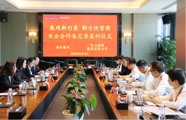 4月18日,青山控股集團(tuán)有限公司與溫州海關(guān)在青山總部大樓15樓會(huì)議室成功舉行“展現(xiàn)新形象,戮力促營商”關(guān)企合作備忘錄簽約儀式。龍灣區(qū)副區(qū)長余安江,溫州經(jīng)濟(jì)技術(shù)開發(fā)區(qū)海關(guān)關(guān)長鮑存建、副關(guān)長施聯(lián)義,青山控股總裁孫建芬等出席儀式。