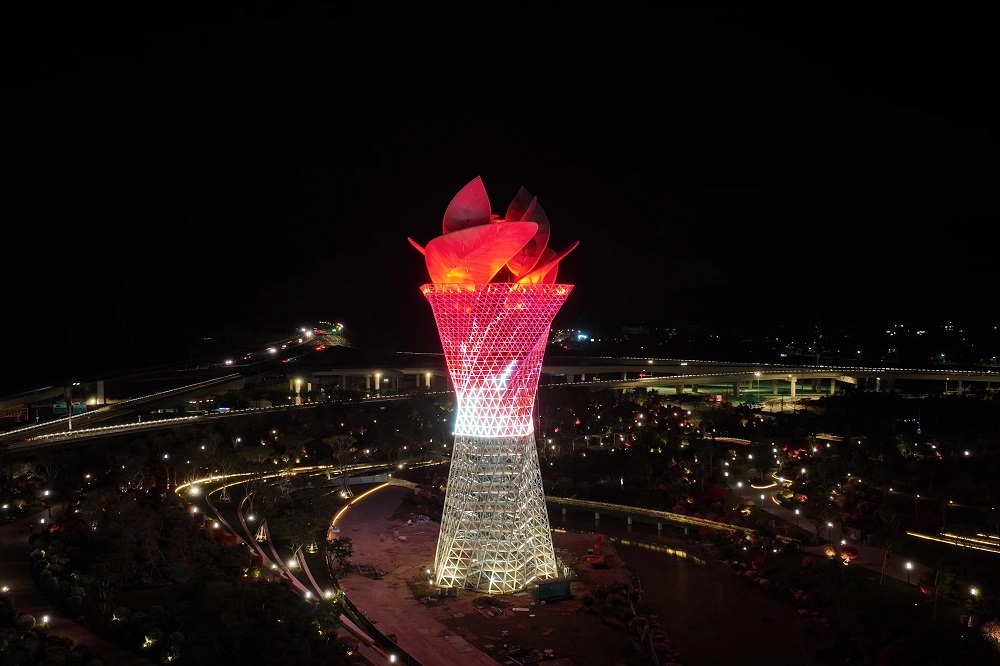 三角梅迎賓塔位于三亞市崖州區(qū)三角梅科博園中央位置,以科學(xué)種子為原型,可動(dòng)態(tài)展示“種子”“姹紫嫣紅”“稻田麥浪”“火炬”“蛟龍入?!蔽宸N映像,是幸福和希望的象征,展示了不銹鋼加工塑性的曲線美,成為傳達(dá)地區(qū)文化、面向世界的窗口和符號(hào)。