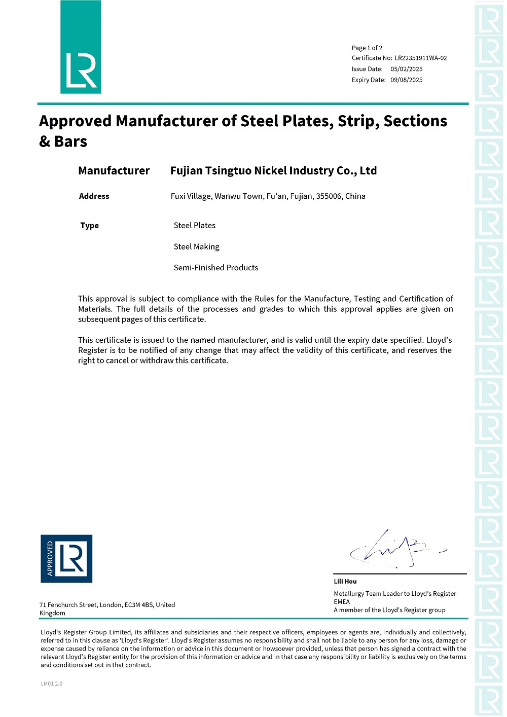 從中國(guó)CCS到英國(guó)LR認(rèn)證,每一個(gè)認(rèn)證背后,都是公司對(duì)產(chǎn)品質(zhì)量的嚴(yán)格把控與不斷超越。青拓不銹鋼中厚板將繼續(xù)堅(jiān)持研發(fā)創(chuàng)新,不斷突破,提升核心競(jìng)爭(zhēng)力,同時(shí)通過(guò)更多權(quán)威機(jī)構(gòu)認(rèn)定,強(qiáng)化質(zhì)量保障,積極進(jìn)行市場(chǎng)布局,為國(guó)內(nèi)外用戶提供更多優(yōu)質(zhì)產(chǎn)品和服務(wù)。