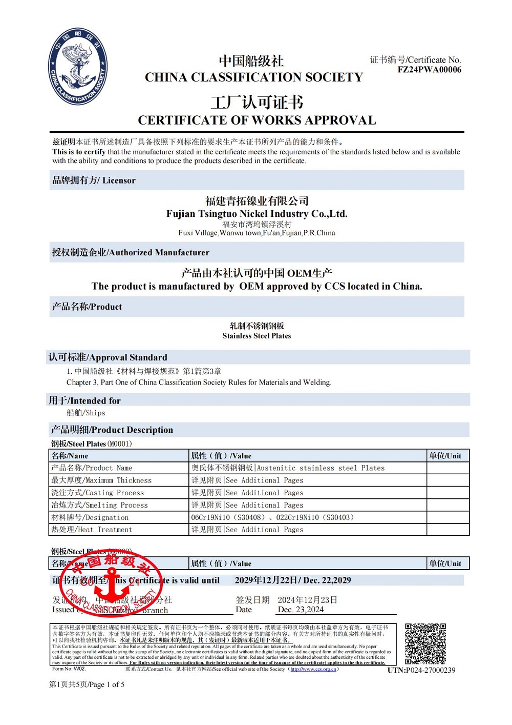 近日,由青拓集團(tuán)研究院牽頭,江蘇青銳達(dá)不銹鋼有限公司配合的不銹鋼中厚板CCS審核項(xiàng)目,經(jīng)過全程跟蹤產(chǎn)品生產(chǎn)流程,包括各項(xiàng)資料準(zhǔn)備、生產(chǎn)流程跟蹤、成品全面測試等驗(yàn)證程序,順利通過中國船級社(CCS)工廠認(rèn)可審核并取得證書。中國船級社的認(rèn)可評定過程適用于通過連續(xù)型工藝批量生產(chǎn),或完全根據(jù)產(chǎn)品生產(chǎn)工藝、生產(chǎn)過程來保證質(zhì)量的產(chǎn)品。中國船級社認(rèn)可證書作為企業(yè)進(jìn)入中國船舶領(lǐng)域、海上設(shè)施及相關(guān)工業(yè)的官方通行證,具有行業(yè)最高的專業(yè)性與權(quán)威性。