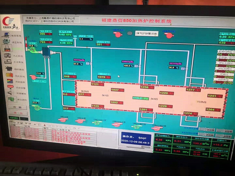 技改之前,看火工在加一段超溫后,需跑到現(xiàn)場通過壓支管風(fēng)閥降溫,升溫時再跑到現(xiàn)場加大風(fēng)閥升溫。技改后,降低了看火工的工作強度,在操作臺通過電腦遠程調(diào)節(jié)加一段分管調(diào)節(jié)閥,即達到降溫升溫的效果。技改后對加一段、加二段、均熱段分管流量顯示和風(fēng)量數(shù)據(jù)對比有直觀參考,提高了操控精準(zhǔn)度和對工藝溫控的命中率,避免和減少超溫引起的燒損和低溫引起的加熱不足,提高了產(chǎn)品質(zhì)量和產(chǎn)量。