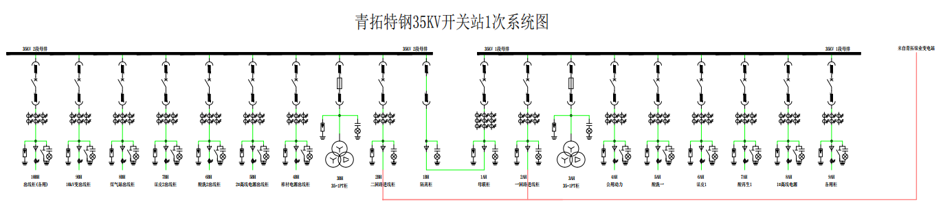 特鋼35KV開關(guān)站采用雙回路供電系統(tǒng),母牌Ⅰ路與母牌Ⅱ路分別使用同一變壓器引出兩路電源(青特Ⅰ線和青特Ⅱ線),兩組母牌之間以母聯(lián)柜和隔離柜連接。正常運(yùn)行時(shí),青特Ⅰ、Ⅱ線同時(shí)對(duì)35KV開關(guān)站內(nèi)的兩路母牌供電。在需要進(jìn)行檢修作業(yè)時(shí),正確地使用雙回路供電系統(tǒng),可以做到單獨(dú)檢修青特Ⅰ、Ⅱ線任意一側(cè)電源線路,而生產(chǎn)車間用電不受影響。