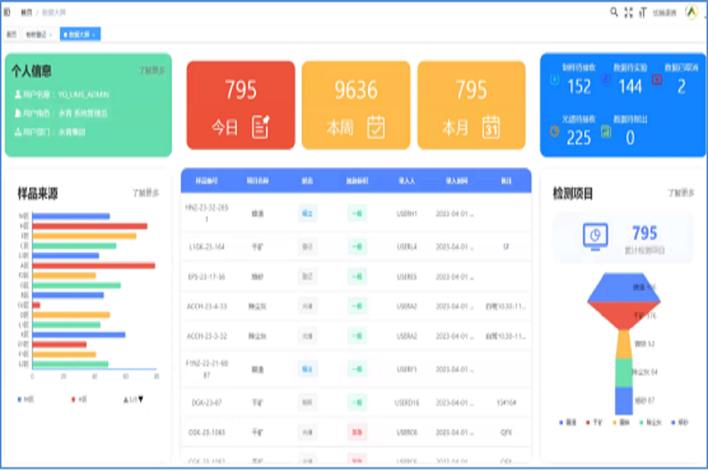 在數(shù)據(jù)可視化方面,LIMS系統(tǒng)的大屏顯示功能為用戶帶來了更直觀的體驗(yàn)。用戶可以輕松查看來樣部門、實(shí)驗(yàn)項(xiàng)目以及當(dāng)日、本周和本月的樣品數(shù)據(jù),從而更好地掌握實(shí)驗(yàn)進(jìn)度和數(shù)據(jù)變化,為用戶提供了一個(gè)集中的信息源,有助于他們更好地協(xié)調(diào)和管理各項(xiàng)工作任務(wù)。