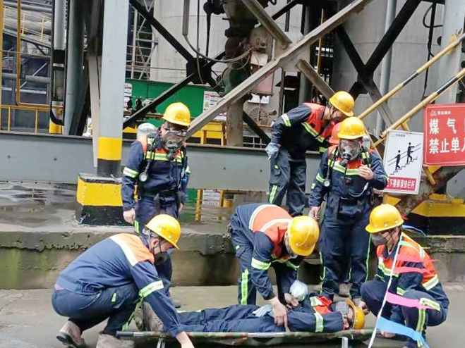 演練模擬一期高爐兩名員工在2#爐布袋除塵箱體受限空間內(nèi)作業(yè),作業(yè)前未按照操作規(guī)程執(zhí)行“先通風(fēng)、再檢測(cè)、后作業(yè)”的規(guī)定,在作業(yè)過程中突然倒下,喊話無應(yīng)答,經(jīng)現(xiàn)場(chǎng)檢測(cè)為氮?dú)庑孤?dǎo)致受限空間安全事故?,F(xiàn)場(chǎng)人員發(fā)現(xiàn)后,立即通過對(duì)講機(jī)報(bào)告指揮部,總指揮接到報(bào)告后發(fā)布指令:立即啟動(dòng)車間受限空間應(yīng)急預(yù)案,按照應(yīng)急演練方案展開救援,保持現(xiàn)場(chǎng)通風(fēng)。醫(yī)療救援小組到達(dá)后立即開展救護(hù)工作。搶修小組對(duì)泄漏設(shè)備進(jìn)行堵漏搶修,采取強(qiáng)制通風(fēng)等措施,直到受限空間各項(xiàng)氣體指標(biāo)恢復(fù)正常,總指揮宣布此次演練結(jié)束。
