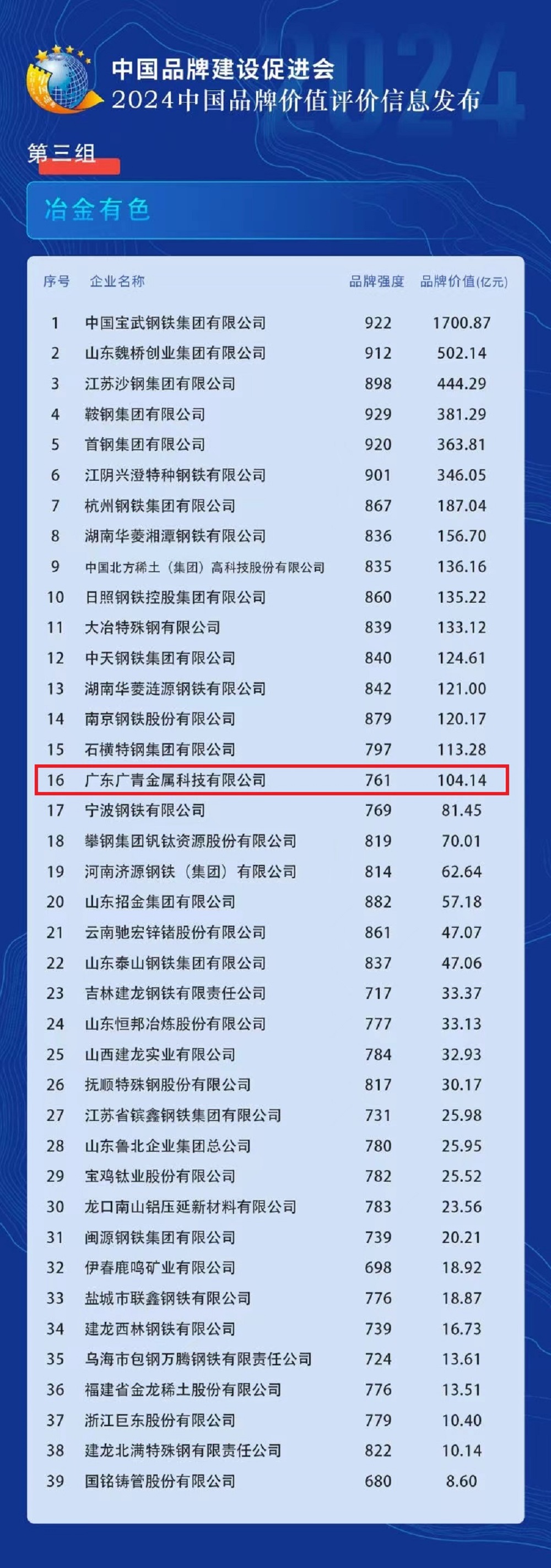 5月11日,在第八個(gè)中國品牌日到來之際,新華社、中國品牌建設(shè)促進(jìn)會(huì)、中國資產(chǎn)評估協(xié)會(huì)、《中國品牌》雜志社等單位在浙江德清聯(lián)合發(fā)布“2024中國品牌價(jià)值評價(jià)信息”。廣東廣青金屬科技有限公司以104.14億元的品牌價(jià)值成功上榜,是冶金有色領(lǐng)域唯一上榜的廣東品牌,位列全國冶金有色領(lǐng)域第16位。