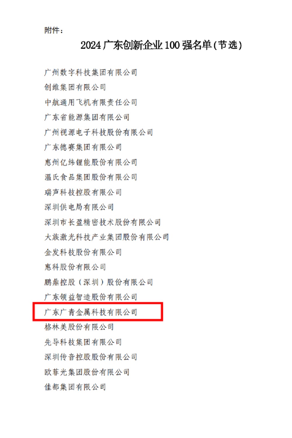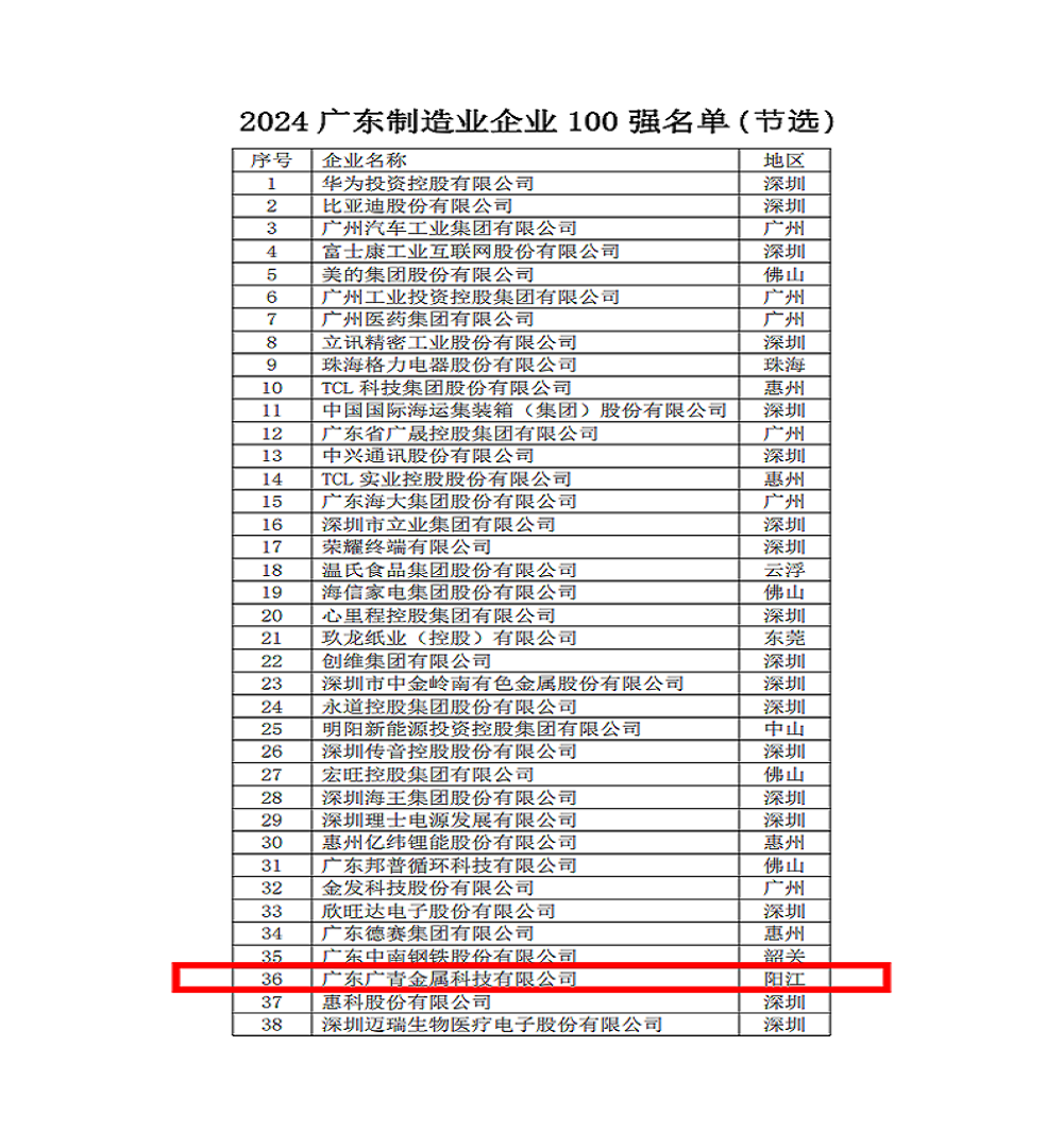9月20日下午,廣東省企業(yè)聯(lián)合會、廣東省企業(yè)家聯(lián)合會發(fā)布2024廣東企業(yè)500強(qiáng)企業(yè)榜單及發(fā)展報告。廣東廣青金屬科技有限公司連續(xù)11年蟬聯(lián)榜單,位列2024廣東企業(yè)500強(qiáng)第84位、廣東制造業(yè)100強(qiáng)第36位,并再次入選2024廣東創(chuàng)新企業(yè)100強(qiáng)。