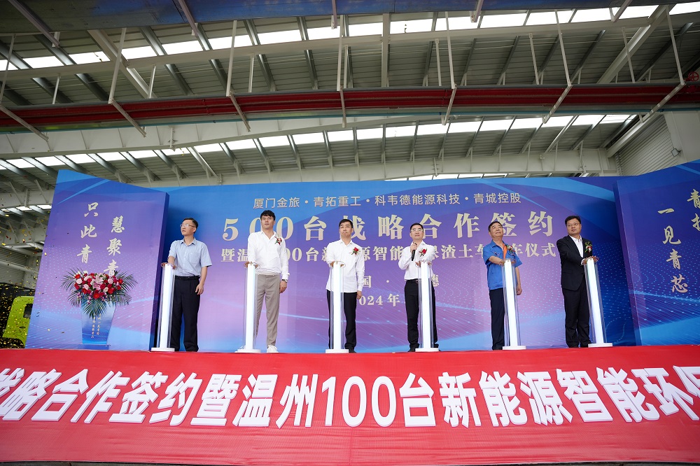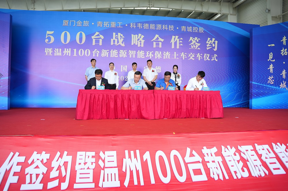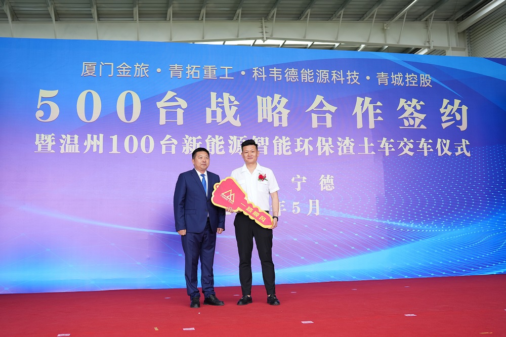 5月21日10點(diǎn)58分,廈門金旅、青拓重工、科韋德能源科技、青城控股 500 臺(tái)戰(zhàn)略合作簽約暨溫州 100 臺(tái)新能源智能環(huán)保渣土車交車儀式于青拓重工廠區(qū)內(nèi)舉行。青拓集團(tuán)有限公司董事長姜海洪,廈門金龍旅行車有限公司黨委書記、董事長彭東慶,福建青拓重工有限公司總經(jīng)理鄭建新,溫州科韋德能源科技有限公司總經(jīng)理盧江,浙江青城控股有限公司董事長章以江等領(lǐng)導(dǎo)親臨活動(dòng)現(xiàn)場。